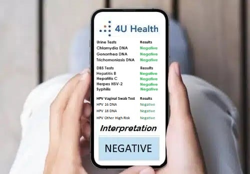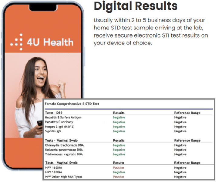 Once we receive your at home STD test, we’ll send your physician-reviewed results in approximately 2-5 business days. 4U Health at home STD test reports are both accurate and easy to read. Your result will tell you whether any of the 8 most common STDs in women are detected in your self-collected finger prick, urine, and vaginal swab samples. If you test positive, we advise you share your STD status with your current and prior sexual partners so they can undergo an STD check. It’s also recommended to share your results with your doctor so they can help determine an appropriate treatment plan.