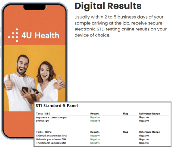 Once we receive your sample, we’ll send your physician-reviewed STD testing results in approximately 2-5 business days. 4U Health at home STD testing reports are both accurate and easy to read. Your 5 panel STD test result will tell you whether any of these common STIs are detected in your self-collected urine and blood samples. If you test positive, we advise you share your STD status with your current and prior sexual partners so they can undergo STD testing. It’s also recommended to share your results with your doctor so they can help determine an appropriate treatment plan.