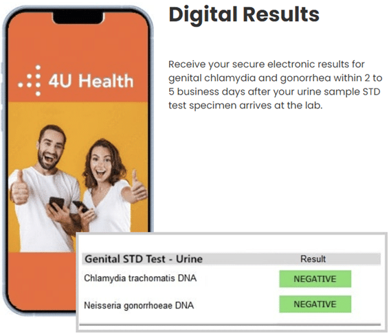 Your test will clearly indicate whether chlamydia or gonorrhea DNA was detected in your urine sample. Once we receive your chlamydia and gonorrhea testing specimen, we’ll discreetly send your physician-reviewed results in approximately 2-5 business days. The 4U Health urine STD test report is both accurate and easy to read.